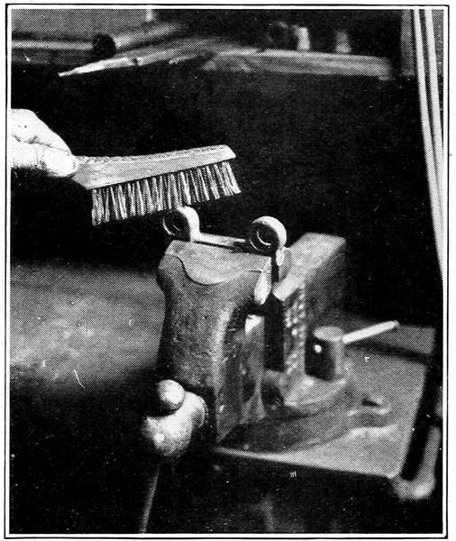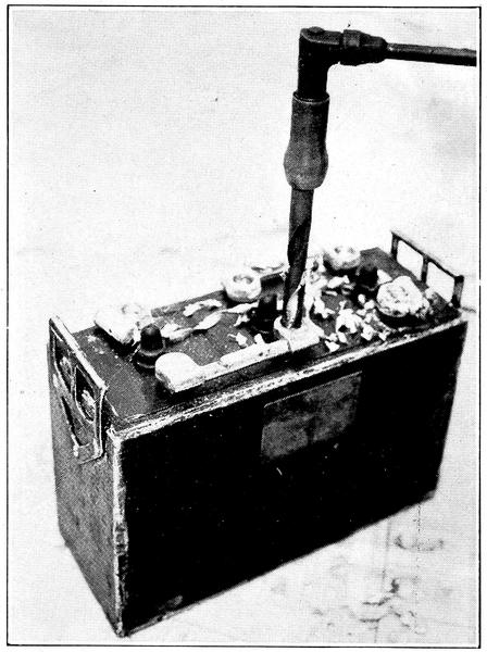 Every battery that has to be opened must have the top connectors drilled off as in Fig. 1, which naturally makes a lot of lead chips. These drillings have to be cleaned off before proceeding with the repair and can, with no loss of time, all be collected, as in Fig. 2, and saved. Then the old sulphated end connectors and parts from “junked” batteries accumulate very fast.
