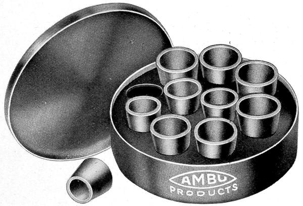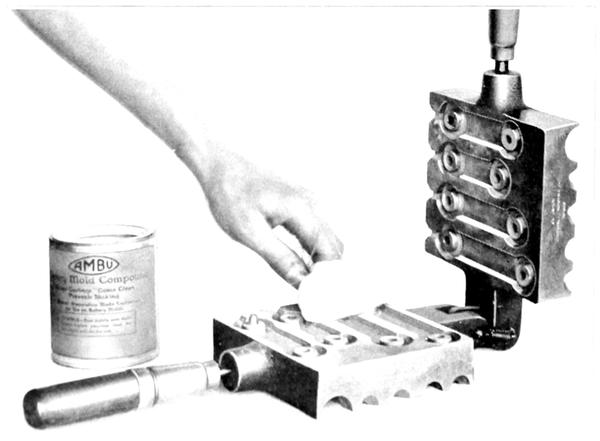 The AMBU mould compound has been developed to eliminate the 9necessity for heating or smoking the mould—it remedies all the pouring troubles and in addition, has chemical ingredients that aid in preventing the mould from rusting. AMBU mould compound is placed in a little sack, contained in each can, and the surface of the mould dusted with the sack, as shown in Figure 6.