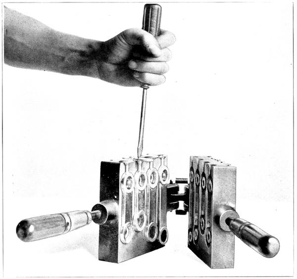 Placing the mould as in Figure 7, the lead is poured in the four openings until the metal projects slightly above the top.