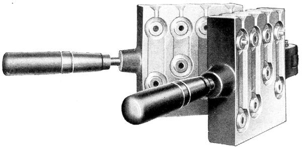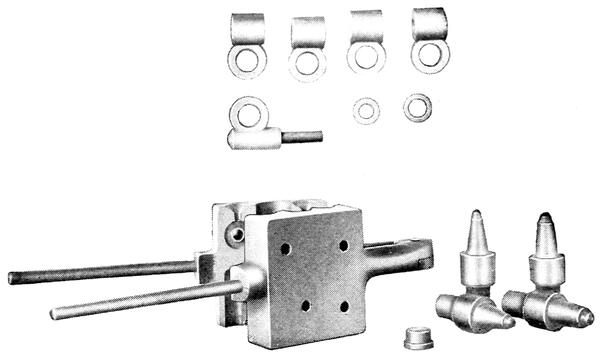The top connectors most frequently replaced are the taper end connections 12and end connections with wire cable leads. For battery men desiring these parts, but not the large combination link mould, the AMBU-Washburn terminal mould, Figure 9, has been designed. It has the same general good features of the larger mould, and casts four end connectors, one wire cable leed and two washers.