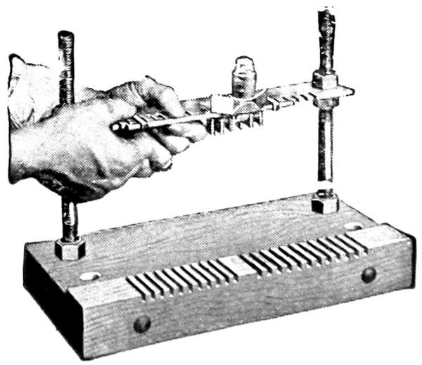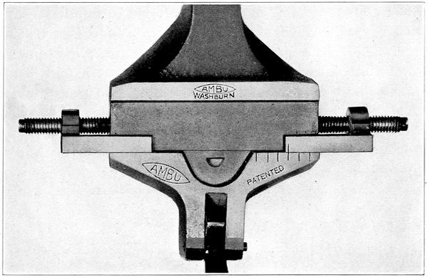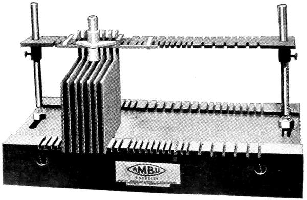 For the large shop or manufacturer, the AMBU-Washburn Post Strap Mould, is made with the special indexing feature of Figure 11. This is easily adjustable and will cast straps of both odd and even numbers of teeth for 7 to 19 plate groups. Otherwise its construction and appearance is the same as Figure 10.