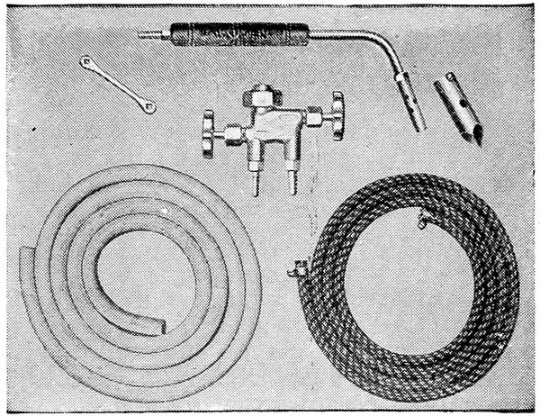 These attachments are great time savers in the repairing of radiators, giving the operator a combination open flame and soldering iron in repairing tubular and honeycomb radiators.