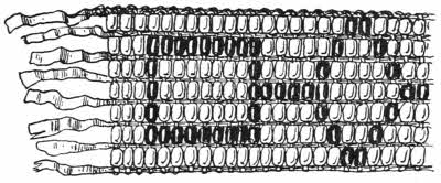 Such symbolical messages are common enough among savage tribes, but without some key it is almost impossible to interpret them. They are so various in their composition that no useful analysis of them can be made. On one such message from West Africa, strung on a string of flat fibre knotted at each end, are a bit of shell, a bit of fur, a bean, a cylindrical stick, a piece of leather, a mass of frog’s eggs or something like it, a flat piece of bark, a feather, a tooth and a shell. In another are two pieces of flat glass kept together with red thread, and two teeth on each side of it, all strung on fibre, and so on.