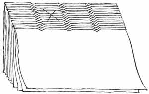 The Battas of Sumatra use different and probably more elaborate messages, as they consist of carefully cut strips of wood, resembling the old spillikins with which our childhood’s days were made happy. These strips of thin wood, about three inches in length, are cut into various shapes which have no obvious collective meaning. In one of them is a capital model of a little broom, accompanied apparently by a series of little clubs and spikes. Such a message might have been sent by an absent brave to his squaw at home, and may have[11] meant that if she didn’t sweep up the wigwam before his arrival she would experience the effect of one or other of the clubs.
