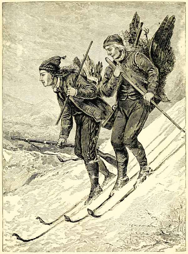 [10] Skees (Norwegian skier) are a peculiar kind of snow-shoes, generally from five to nine feet long, but only a few inches broad. They are made of tough pine-wood, and are smoothly polished on the under side, so as to make them glide the more easily over the surface of the snow. In the middle there are bands to put the feet into, and the front end of each skee is pointed and strongly bent upward. This enables the runner to slide easily over logs, hillocks, and other obstacles, instead of thrusting against them. The skee only goes in straight lines; still the runner can, even when moving with great speed, change his course at pleasure by means of a long pole which he carries for this purpose, and uses as a sort of rudder. Skees are especially convenient for sliding downhill, but are also, for walking in deep snow, much superior to the common American snow-shoes.