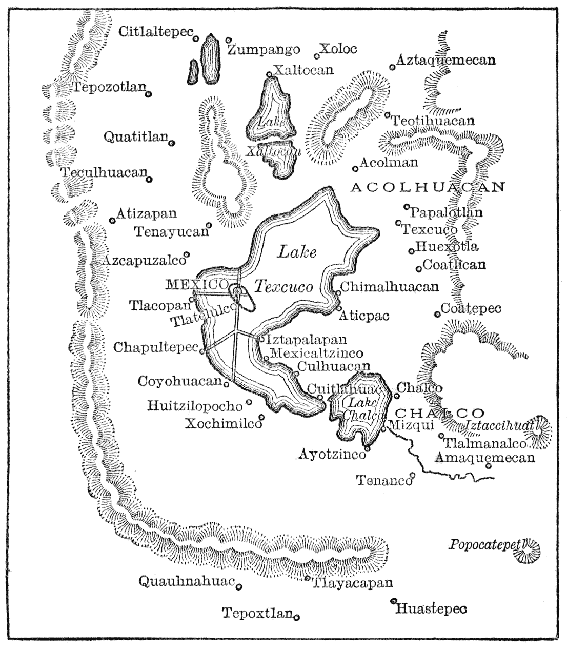 The Tecpanecs were a confederacy of purely Nahua tribes dwelling in towns situated upon the Lake of Tezcuco, the principal of which were Tlacopan and Azcapozalco. The name Tecpanec signifies that each settlement possessed its own chief’s house, or tecpan. [27]This tribe were almost certainly later Nahua immigrants who arrived in Mexico after the Acolhuans, and were great rivals to the Chichimec branch of the race.