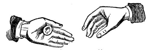 The right hand, having the knuckles and back of the fingers turned toward the spectators, and holding openly a cent, or some similar object, between the thumb and forefinger, must be moved toward the left hand.