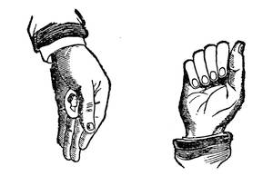 The left hand secretes the object in its palm, while the fingers are allowed to fall loosely down, appearing to retain nothing under them. At the very same moment the right hand must be closed, and remain in shape as if containing the object, with the second joints of the fingers pointed toward the spectators, and the back of the hand toward the ground. The performer then holding his right hand forward, may blow on it and say “Change—fly,” and opening that hand, the spectator deems the object has passed away from it, though in fact it has remained all along in the left hand.