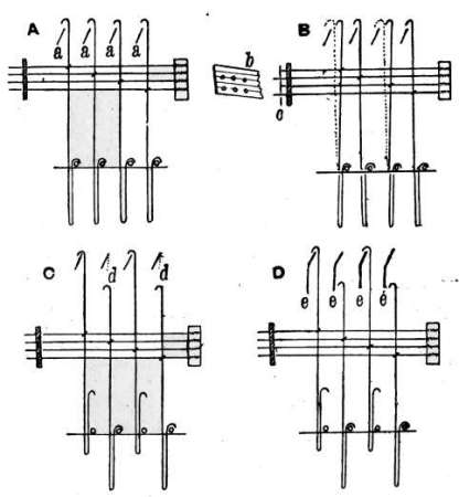 The method of preparing and mounting the draw-loom harness is much the same as that now in use for jacquard harnesses, and, as it is entirely out of use, it is unnecessary to describe it.
