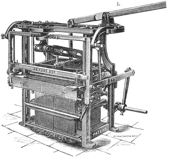 When some thousands of twines were required for the harness, and with a simple of three or four hundred cords, the weight and friction made it very severe work for the drawboy. To assist him a fork, as shown at V, No. 2, Fig. 3, was used. It was made to run to and fro on a carriage, so that when the simples were drawn forward by the lashes, one spike of the fork could be run in behind those drawn forward, while the other spike was in front of them. When the fork was depressed, till the handle T came to the position shown by the dotted lines, it drew down the simple cords, and they could easily be held in that position till a change of draught was required.