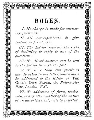 V. No more than two questions may be asked in one letter, which must be addressed to the Editor of The Girl's Own Paper, 56, Paternoster Row, London, E.C.