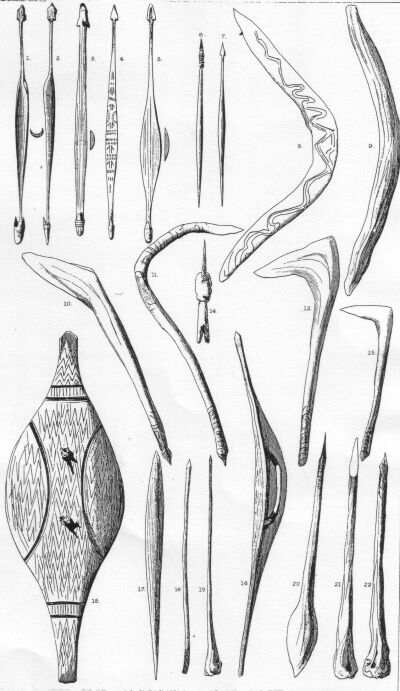 9. 10, 11, 12. Needles, etc. from the fibulas of kangaroos, wallabies, emus, etc.