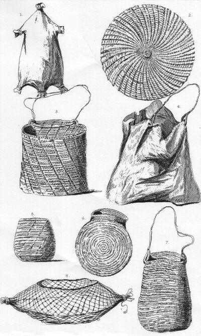 8. The Rok-ko, or net bag, made of a string manufactured from the rush, it is carried by the women, and contains generally all the worldly property of the family, such as shells and pieces of flint for knives--bones for needles--sinews of animals for thread--fat and red ochre for adorning the person--spare ornaments or belts--white pigment for painting for the dance--a skin for carrying water--a stone for pounding roots--the sacred implements of the husband carefully folded up and concealed--a stone hatchet--and many other similar articles. The size of the rok-ko varies according to the wealth of the family; it is sometimes very large and weighty when filled.