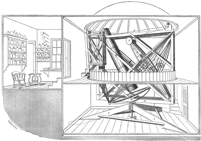 There are only two windows, and they are near the southern angles of the roof. While they admit sunshine on some occasions, they can on others be closed, and the interior be reduced to darkness. In the southeast corner a small opening e may allow a solar beam three inches in diameter to come in from a heliostat outside. The greatest facilities are thus presented for optical and photographical experiments, for in the latter case the whole room can be used as a camera obscura.