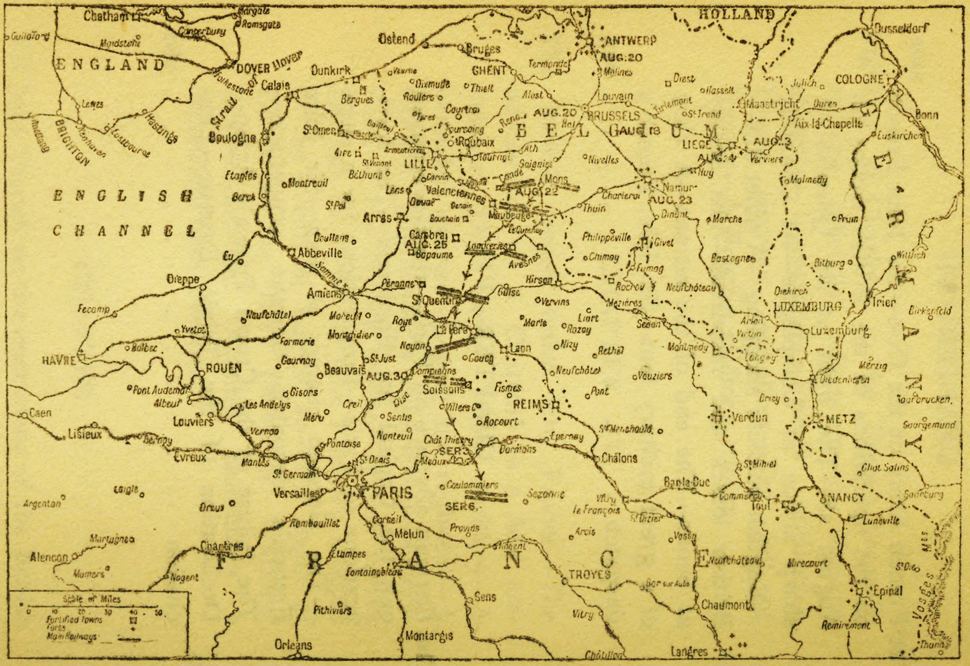 An attempt has been made in the foregoing pages to tell the story of how the Allied forces retreated towards Paris, after the great battle of August 22–24 at Mons on the Belgian frontier, and continued to withdraw until the battle at Senlis on September 1. This account is chiefly concerned with the actions of the British troops who undoubtedly on the left, by their dogged fighting, had saved the situation during the first critical days. But their natural position having been lost, it was the policy of the Allies to retire, and with entrenched fortifications191 protecting their left, prepare for a counter-attack from the advancing Germans.