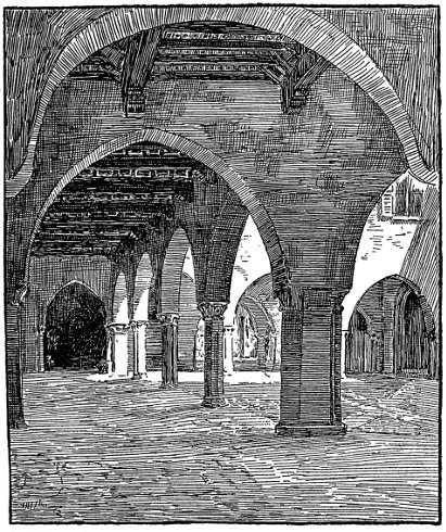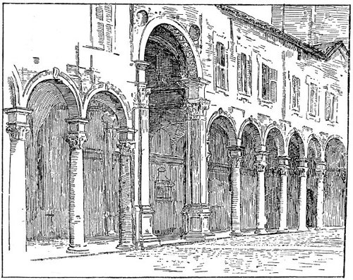 377How difficult it is to-day, in this exhumed corpse of her old home, these dry bones of the past, denuded of all their old richness of detail and decoration, to realise that vivid young presence. Yet the sun shines gloriously in the wide cortile this afternoon, making a stately pattern of light and shade in the arcades, and we recognise at least in the fair and spacious proportions of the building and the grace of sculptured column and curving arch, that Renaissance beauty of architecture which made it once a worthy setting for such a prince and princess as Lodovico il Moro and Beatrice d’Este.