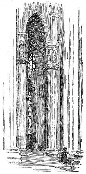 The Duke continued the construction of the Rocchetta also, which his father had left unfinished, and gave orders for the decoration of the great Sala della Palla on its north-east side. But it is with the Corte Ducale that the fateful memories of this prince are especially associated. Thither he returned on the Feast of St. Thomas, 1476, with the glory of a victorious campaign freshly investing him, yet abstracted and pensive, possessed with a sense of the nearness of death, so that he bid the singers of his chapel to repeat every day in the midst of the joyful celebrations of the season, the mournful cry from the Office of the Dead, Maria Mater Gratiæ, Mater Misericordiæ.... In the painted halls behind the chapel the usual Christmas ceremonies were carried out, and in the Sala dei Fazoli the Yule log was solemnly lighted upon the hearth in the presence of the tyrant and his family, and of all the great feudatories of state. In the Sala delle Columbine—painted with doves—the Duke, clad in a long crimson robe, entertained his courtiers on Christmas Day, and discoursed on the greatness of Casa Sforza, pointing out with unconscious irony how firmly its fortunes were assured in the many descendants of his father Francesco then existing in health and prosperity. We may picture his tall figure on the following day, clad in the doublet of crimson satin lined with sable, for which, with characteristic vanity, he had cast aside his cuirass, fearing to appear too stout if he wore the armour beneath; and in the long hose, one crimson, one white, worn by the princes of Milan, passing through the loggia, which still exists, though much restored, and down the great staircase into the courtyard, on his way to attend Mass in S. Stefano. He had kissed his little sons, and parted from them 373with a strange hesitation—this man who, as his daughter Caterina proudly declared, never knew fear. Mounting his horse in the outer court, he rode out beneath the Tower of Filarete, followed by a gorgeous throng of courtiers, and his brilliant figure disappears from the Castello for ever. Later on the same day a messenger passed out of the gate charged by Bona with three rings, a turquoise, a ruby, and a precious seal, and with a vest of white cloth of gold, for the adornment of his body, which lay laced with twenty-three dagger wounds, in the Canonica of S. Stefano.