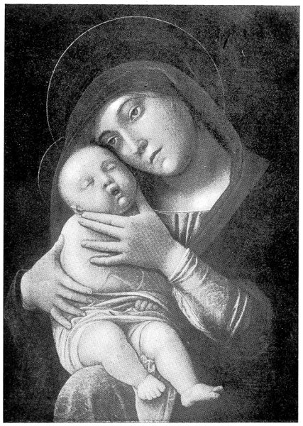Gabinetto dei Veneti.—The small picture by Mantegna is the greatest treasure of the collection. It is the most appealing of all his Madonna pictures. Never has the subject of mother and child been so sympathetically expressed, even among Italian masters, unless we except Luca della Robbia. The sleeping baby is touchingly true to nature, its round little form under the tightly wound drapery is perfectly given, and there is a depth of feeling in the mother’s thoughtful, almost sad expression as she clasps Him to her, as if the very intensity of her love gave her a sense of foreboding. It is a late work of the master, painted with perfect mastery of form and a breadth of technique in which there is none of the dryness of his early 357years. Christ with the Symbols of the Passion and St. Francis kneeling to receive the blood in a chalice, (620) by Carlo Crivelli, has a mystical feeling and the beauty of a miniature painting. St. Sebastian tied to a tree (621) is also a characteristic picture of Crivelli’s. Pietà (623), a miniature in an ornamental Gothic frame is of the school of Murano, probably of the Vivarini. Pietà (624) is by an imitator of Giovanni Bellini. By Bonsignore is a good profile of an old man (627). Cariani has a small Holy Family (613), gracious in colour and composition. Lorenzo Lotto, a Madonna with St. John Baptist and a prophet (614). A rather stiff altarpiece, Madonna with angels making music (610), is by Marcello Fogolino, a painter of Vicenza.