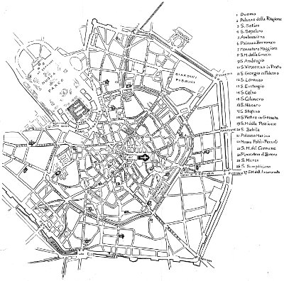 Milan is to-day the most modern of Italian cities. Her Risorgimento in the last century, accomplished with the pouring out of blood and the efforts of a strenuous virtue, makes for her a mighty and sufficing past in the near background, and she seems to stand wholly on this side of it, triumphant and new-create. Neither Nature nor the further centuries have, you feel, any longer part in her. Who of the numberless travellers from the North, as they lose the vision of mountain, lake and green champaign, just traversed, in the bustle and confinement of the crowded streets, realises that this solid mass of brick and stone, this vast hive of human beings, is the slow product of that enchanting country, of its rivers and fertile soil, built up and moulded by human passion and labour during thousands of years amid the changes and chances of extraordinarily varied fortunes. Only when his eyes, lifted above the regular roof-lines of the modern streets, light upon the 2Gothic pinnacles of the Duomo, and a further acquaintance with the city discovers, wedged among the growths of yesterday, the many relics of her older past—the Castle of the fifteenth century Sforza, Renaissance palaces and churches, St. Ambrogio and its compeers of the era of liberty, a rare fragment of the older imperial civilisation—does he become conscious of the long and painful course of the centuries, and remember that he stands in the secular capital of Lombardy, on ground as storied almost as the sacred dust of Rome.