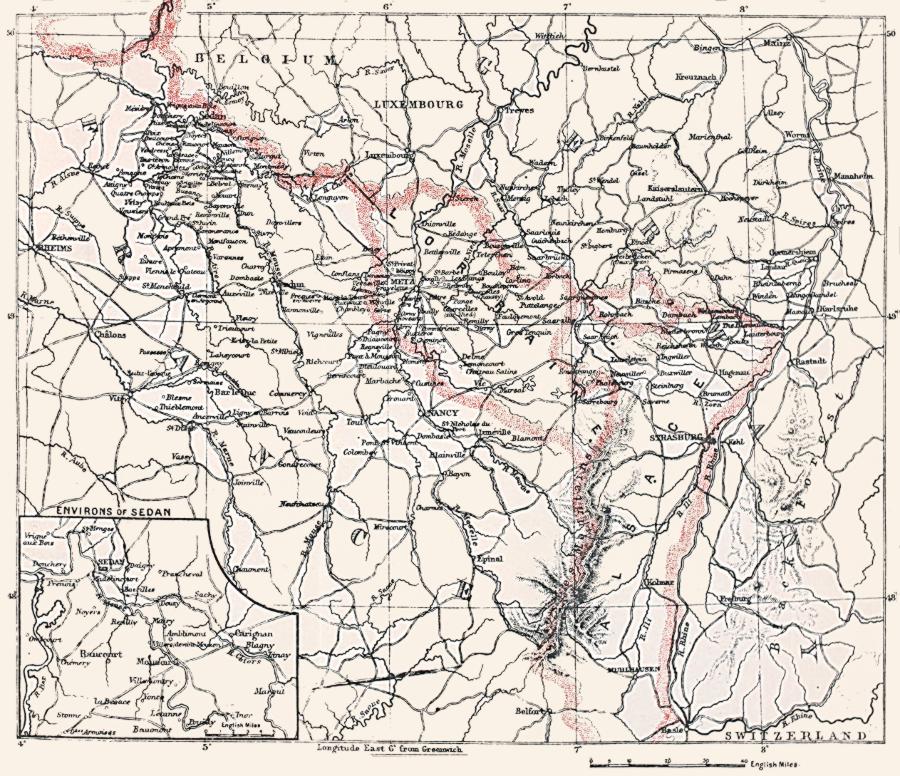 The influence of this mountain range upon the offensive [p 68] and defensive operations of the rival armies will be readily understood. The French could only unite to meet their opponents in the Prussian provinces at or north of Kaiserslautern; while the Germans, assuming that their adversaries assembled forces in Alsace, as well as in Lorraine, would not be in direct communication until their left wing had moved through the hill-passes and had emerged in the country between the Sarre and Meurthe.