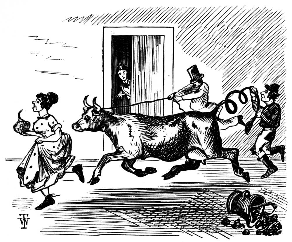 | Special Points about the Bovine Race.—Directions in Feeding.—Preparations to receive the Animal.—Her Arrival.—An awful Pause.—The Fray about to begin.—Intelligence of Cows and Biddies.—Victory.—A Calm.—Cow Complainings.—Approaching Storm.—A Tempest in a back Yard.—Soothing Effects of “Mash.”—Immense Profits and glorious Prospects for the Future.—Peculiarities and Eccentricities of the Race as exhibited in a confined Space.—She is sent to the Country for the benefit of her Health | 19 |
