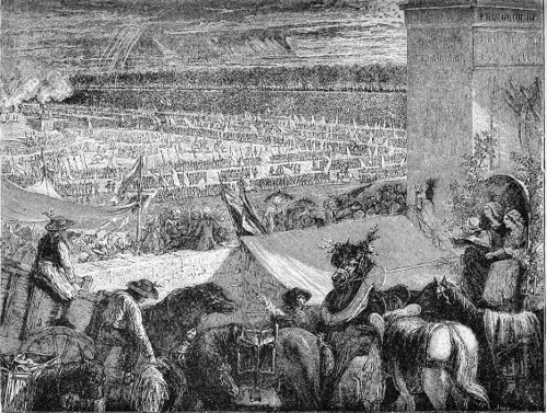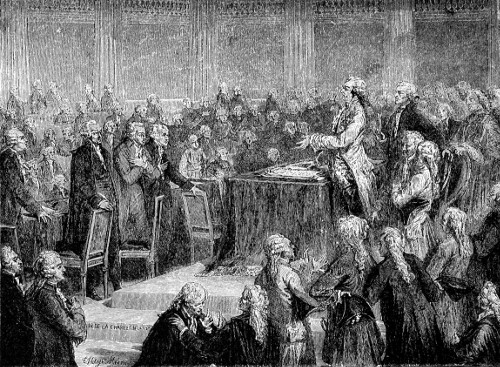 “While the principles of the American Devolution were fermenting in France, La Fayette, the hero and 467favorite of the hour, was an honored guest at royal tables and royal camps. The proud Spaniard and the Great Frederick of Germany alike welcomed him, and everywhere he announced his faith in government founded on the American idea. The financial crisis in the affairs of King Louis on the one hand, and the rising tide of the popular passion on the other, compelled the summons of the Assembly of Notables at Versailles. All the great officers of state, the aristocracy, the titled clergy, the royal princes, were there, but no representative of the people. La Fayette spoke for them, and, fearless of the efforts of the brother of the king to put him down, he demanded religious toleration, equal taxes, just and equal administration of the laws, and the reduction of royal expenditures to fixed and reasonable limits. This overturned the whole feudal fabric which had been in course of construction for a thousand years. To make effectual and permanent this tremendous stride toward the American experiment, he paralyzed the court and cabinet by the call for a national assembly—an assembly of the people. Through that assembly he carried a declaration of rights, founded upon the natural liberties of man, a concession of popular privilege never before secured in the modern history of Europe; and, going as far as he believed the times would admit toward his idea of an American republic, he builded upon the ruins of absolutism a constitutional monarchy.