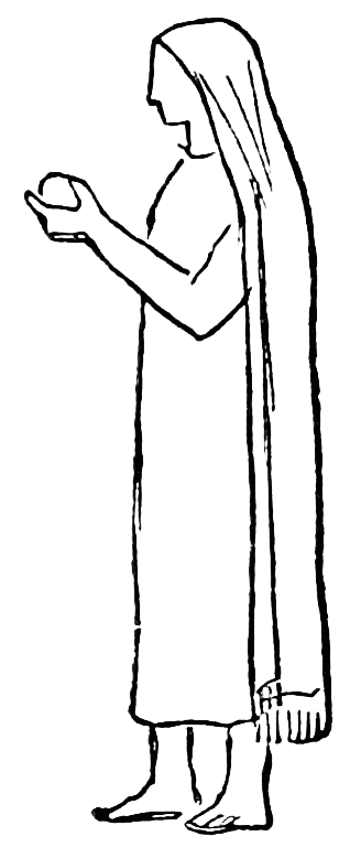 The modes of wearing the peplon were at least as numerous as the ways of adjusting the pallium. In many of the ancient alto-reliefs women are represented with both arms and hands concealed by the peplon. Indeed, there does not seem to have been much coquetry displayed in wearing the peplon. It was emphatically one of those garments used for comfort and not for show. Nevertheless, from the fineness of the material and the great area of the peplon, it was, perhaps, more picturesque and graceful than more formal pieces of finery.