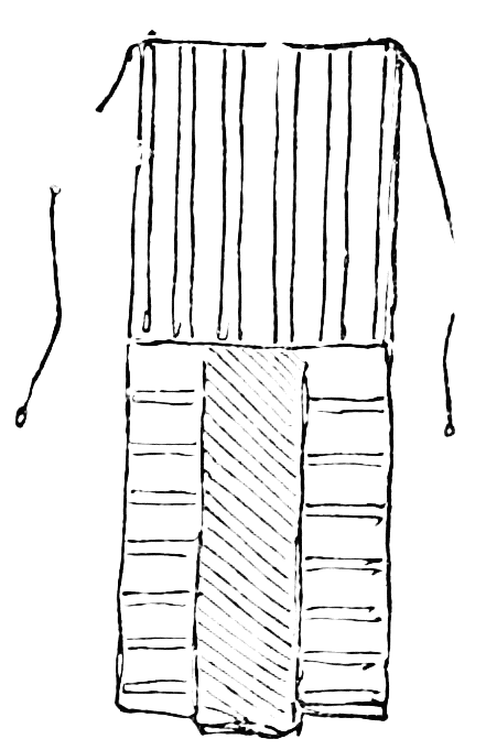 When the cloth was tied on the head, the two outer divisions were brought over the shoulders, the middle one being left to hang down the back.