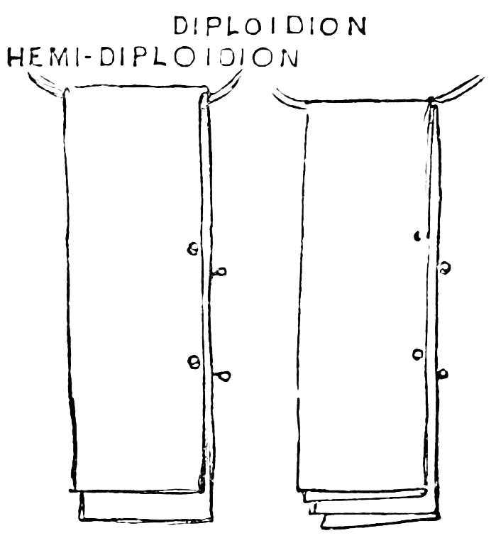 These chitons were, however, not made like our shirts and chemises. They consisted simply of two square pieces of stuff, one for the front and one for the back. These pieces were linked together on the shoulders by the means of clasps, brooches, or fibulæ, and the different varieties of the Dorian chiton were mainly due to the degree in which they{10} were sewn together at the sides. The pieces never appear to have been united above the waist or girdle, but below this zone they were sometimes united on both sides down to the ground. Sometimes one side was open as high as the middle of the thigh.