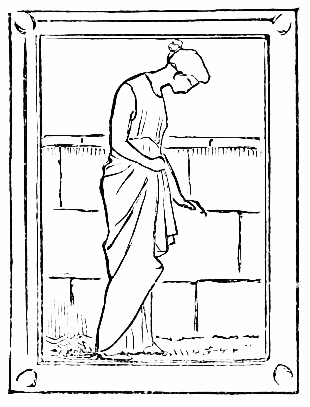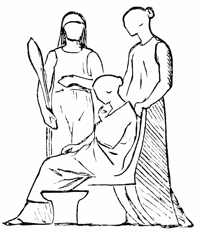 The “diploidion” and “hemi-diploidion” are supposed by Müller and other authorities to have been a kind of double chiton, but I do not think this hypothesis to be correct. I rather believe these names to have been given to a kind of short mantle, which was quite independent of the chiton. Although, as I have already stated, the chiton was constantly worn alone, yet no person could be considered what we should call full dressed without the “pallium” or cloak. In Sparta, although the young girls invariably wore the chiton alone, it would have been considered highly improper for any married{12} woman to appear without some upper garment. Indeed, unless the climate has changed very much within the last two thousand years, a cloak, (and a good thick one too) would be indispensable. The only time I have ever landed at Athens snow lay thick on the ground, and a bitter cold wind swept down from Hymettus.