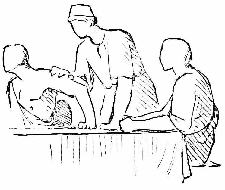The Egyptian men shaved their heads, and commonly wore either a skull-cap or the well-known cloth which we find everywhere from the gigantic sphinx to the most minute coin.