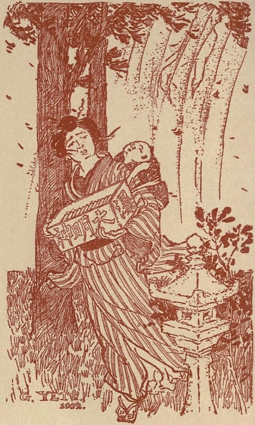 "He ought to be hungry," exclaimed the mother; "I must give him his milk presently."... "Poor O-Katsu!" said the Obaa-San, helping to remove the wraps in which the boy had been carried,—"why, you are all wet behind!" Then, with a husky scream, the helper vociferated, "Arà! it is blood!"