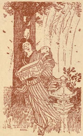 One icy winter's evening, thirty-five years ago, the women and girls employed at a certain asa-toriba, or hemp-factory, in Kurosaka, gathered around the big brazier in the spinning-room after their day's work had been done. Then they amused themselves by telling ghost-stories. By the time that a dozen stories had been told, most of the gathering felt uncomfortable; and a girl cried out, just to heighten the pleasure of fear, "Only think of going this night, all by one's self, to the Yurei-Daki!" The suggestion provoked a general scream, followed by nervous bursts of laughter.... "I'll give all the hemp I spun to-day," mockingly said one of the party, "to the person who goes!" "So will I," exclaimed another. "And I," said a third. "All of us," affirmed a fourth.... Then from among the spinners stood up one Yasumoto O-Katsu, the wife of a carpenter;—she had her only son, a boy of two years old, snugly wrapped up and asleep upon her back. "Listen," said O-Katsu; "if you will all really agree to make over to me all the hemp spun to-day, I will go to the Yurei-Daki." Her proposal was received with cries of astonishment and of defiance. But after having been several times repeated, it was seriously taken. Each of the spinners in turn agreed to give up her share of the day's work to O-Katsu, providing that O-Katsu should go to the Yurei-Daki. "But how are we to know if she really goes there?" a sharp voice asked. "Why, let her bring back the money-box of the god," answered an old woman whom the spinners called Obaa-San, the Grandmother; "that will be proof enough." "I'll bring it," cried O-Katsu. And out she darted into the street, with her sleeping boy upon her back.