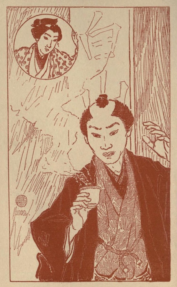 On the fourth day of the first month of the third Tenwa,—that is to say, about two hundred and twenty years ago,—the lord Nakagawa Sado, while on his way to make a New Year's visit, halted with his train at a tea-house in Hakusan, in the Hongō district of Yedo. While the party were resting there, one of the lord's attendants,—a wakatō[1] named Sekinai,—feeling very thirsty, filled for himself a large water-cup with tea. He was raising the cup to his lips when he suddenly perceived, in the transparent yellow infusion, the image or reflection of a face that was not his own. Startled, he looked around, but could see no one near him. The face in the tea appeared, from the coiffure, to be the face of a young samurai: it was strangely distinct, and very handsome,—delicate as the face of a girl. And it seemed the reflection of a living face; for the eyes and the lips were moving. Bewildered by this mysterious apparition, Sekinai threw away the tea, and carefully examined the cup. It proved to be a very cheap water-cup, with no artistic devices of any sort. He found and filled another cup; and again the face appeared in the tea. He then ordered fresh tea, and refilled the cup; and once more the strange face appeared,—this time with a mocking smile. But Sekinai did not allow himself to be frightened. "Whoever you are," he muttered, "you shall delude me no further!"—then he swallowed the tea, face and all, and went his way, wondering whether he had swallowed a ghost.