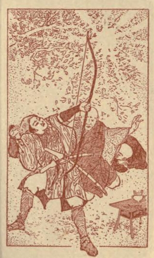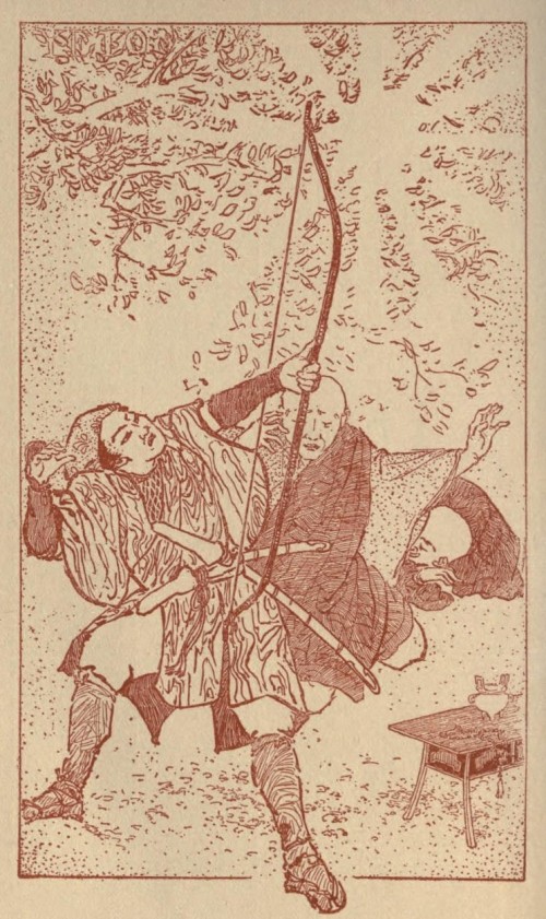 Then the priest and the boy, prostrating themselves, began with exceeding fervour to repeat the holy invocation to Fugen Bosatsu. But suddenly the hunter rose up behind them, bow in hand; and, bending his bow to the full, he sent a long arrow whizzing straight at the luminous Buddha, into whose breast it sank up to the very feathers. Immediately, with a sound like a thunder-clap, the white light vanished, and the vision disappeared. Before the temple there was nothing but windy darkness.