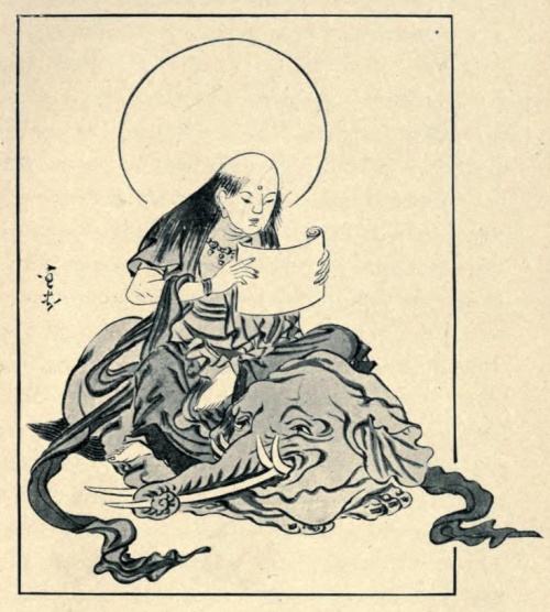 "Friend, I must tell you that wonderful things have happened here since the last time I saw you. I do not certainly know why such things should have happened in my unworthy presence. But you are aware that I have been meditating, and reciting the sûtras daily, for many years; and it is possible that what has been vouchsafed me is due to the merit obtained through these religious exercises. I am not sure of this. But I am sure that Fugen Bosatsu[1] comes nightly to this temple, riding upon his elephant.... Stay here with me this night, friend; then you will be able to see and to worship the Buddha."