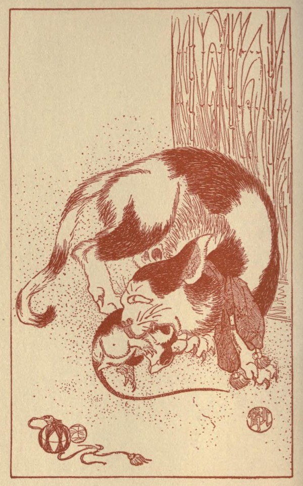 We call her Tama ("Jewel")—not because of her beauty, though she is beautiful, but because Tama is a female name accorded by custom to pet cats. She was a very small tortoise-shell kitten when she was first brought to me as a gift worth accepting,—a cat-of-three-colours (miké-neko) being somewhat uncommon in Japan. In certain parts of the country such a cat is believed to be a luck-bringer, and gifted with power to frighten away goblins as well as rats. Tama is now two years old. I think that she has foreign blood in her veins: she is more graceful and more slender than the ordinary Japanese cat; and she has a remarkably long tail, which, from a Japanese point of view, is her only defect. Perhaps one of her ancestors came to Japan in some Dutch or Spanish ship during the time of Iyéyasu. But, from whatever ancestors descended, Tama is quite a Japanese cat in her habits;—for example, she eats rice!