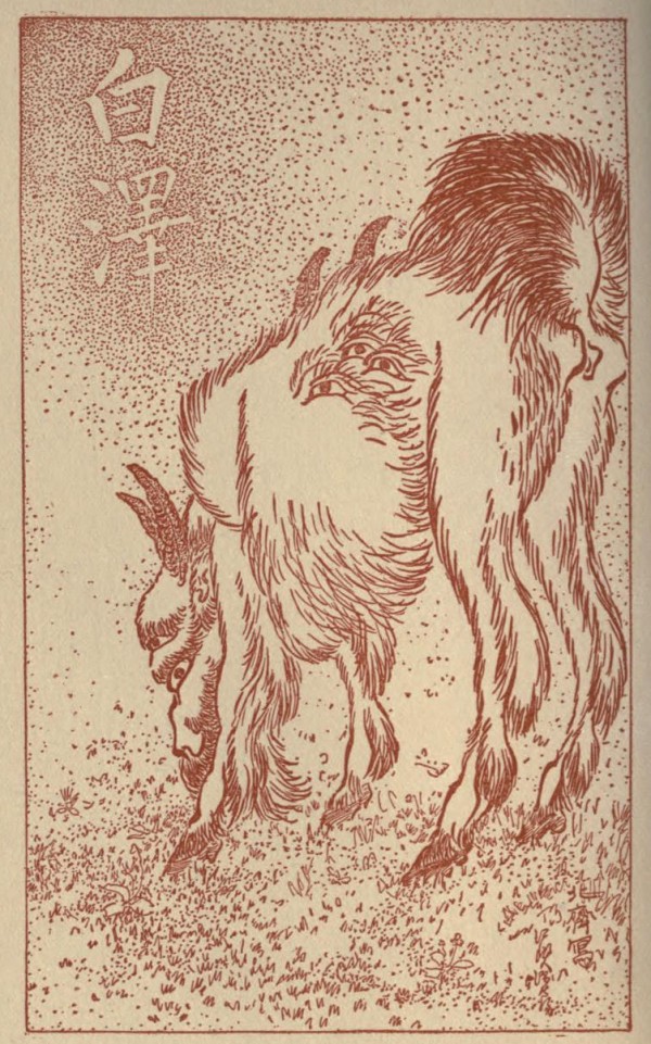 The name of the creature is Baku, or Shirokinakatsukami; and its particular function is the eating of Dreams. It is variously represented and described. An ancient book in my possession states that the male Baku has the body of a horse, the face of a lion, the trunk and tusks of an elephant, the forelock of a rhinoceros, the tail of a cow, and the feet of a tiger. The female Baku is said to differ greatly in shape from the male; but the difference is not clearly set forth. In the time of the old Chinese learning, pictures of the Baku used to be hung up in Japanese houses, such pictures being supposed to exert the same beneficent power as the creature itself. My ancient book contains this legend about the custom:—