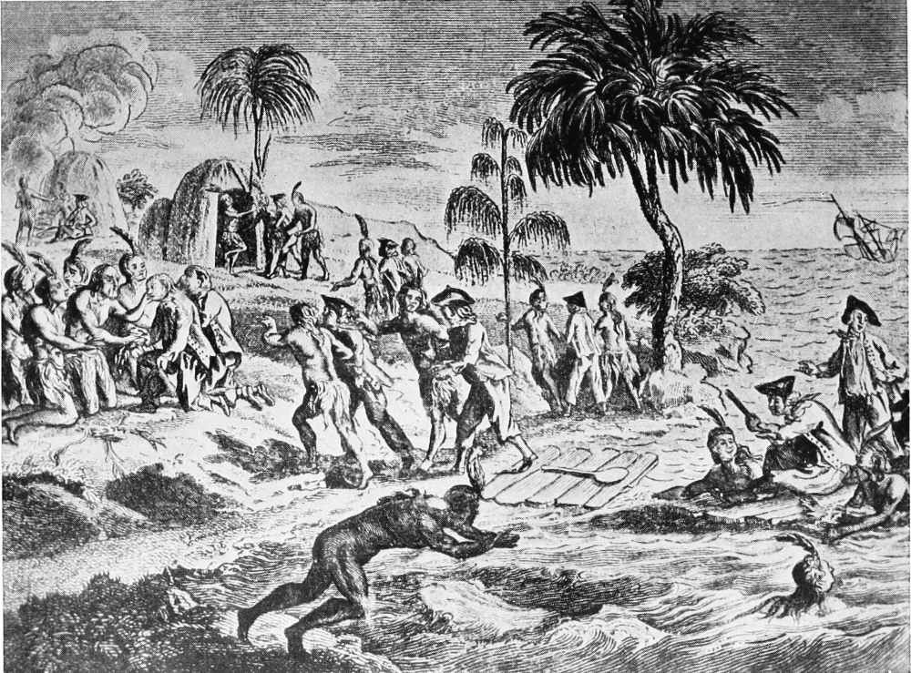 During the evening of the 10th of January, 1710, the four ships Duke, Dutchess, Marquis and Batchelor, all heavily laden, left the coast of California for the Island of Guam, one of the Ladrones, that being the first stage on their journey home to Great Britain. Provisions were now extremely short, and 5 men were forced to subsist on 1-1/2 lb. of flour, and 1 small piece of meat between them per day, with 3 pints of water each “for drink and dressing their victuals.” Stern measures were therefore necessary, and a seaman who stole several pieces of pork was punished with the cat-o’-nine tails by his mess-mates. During this extreme scarcity, Rogers was forced to adopt a measure which is perhaps rather a humiliating episode in his career. To his Negro sailors, whom he had promised to treat as Englishmen, and who had behaved themselves well, he could only allow 6 in a mess to have “the same allowance as 5 of our own men, which will but just keep those that are in health alive.”