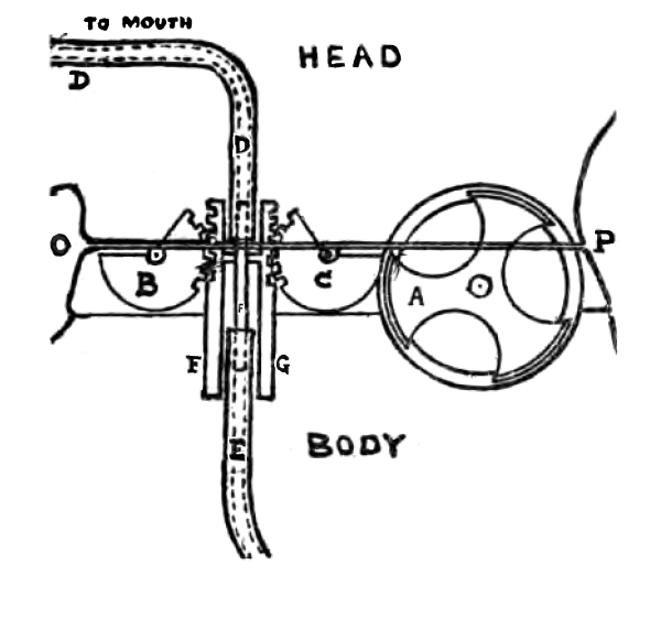 The head of this figure, which is otherwise separate from it, is attached to it by a peculiar shaped wheel pivotted between the shoulders of the body. This wheel may be described as a circular disc having an expanded rim so that a section taken through a radius would be of the form of the letter T, out of this wheel three nearly semicircular gaps are cut, each occupying sixty degrees of the circumference, and therefore leaving three portions of the rim, each also of sixty degrees. The neck attached to the head is fitted with a hollow T shaped circular groove into which the T ended [37] arms of the wheel pass in succession as the wheel is rotated. As the groove in the head occupies nearly sixty degrees it follows that as the wheel is rotated the rim of one arm can never leave the groove before [38] the rim of the following arm has entered it, and so the head is attached to the body in every position of the wheel. When the knife is passed between the head and the body it strikes against one of the spokes of the wheel, moving it forward and pushing one of the arms out of the groove in the head, while, at the same time, another, following behind the knife, takes its place, and thus the head can never be detached from the body. Such an automaton is the little negro which I hold in my hand, for which I am indebted to the fraternal generosity of Brother Manning. Hero’s description, however, carries the ingenuity of the device considerably farther, for in his automaton, not only is it impossible to sever the head from the body by passing a knife through the neck, but the figure can actually drink both before and after the operation. The illustration on the screen (Fig. 13) is a sort of modern restoration of the Harley drawing, showing the disposition of the various parts of the mechanism. (A) represents the wheel by which the [39] head is held on to the body, and it will be noticed that a tube D D leads from the mouth to the neck and another, E, from the neck through the body; these two tubes, marked respectively D D and E, are connected by the sliding tube F, which is attached to the two racks F and G, into [40] which are geared the two toothed wheels B and C. When the knife is passed from P to O it first rotates the holding-on wheel A, and then strikes against the radial face of the wheel C, turning it through a small arc, thereby moving the racks, and, sliding the connecting tube F out of D, allowing the knife to pass, which next strikes the radial face of the wheel B, and, by turning it, restores the sliding connecting tube F into D, and thus recompletes the connection. The sucking-up the liquid being accomplished in a similar manner to that in the drinking bird already described.[6]