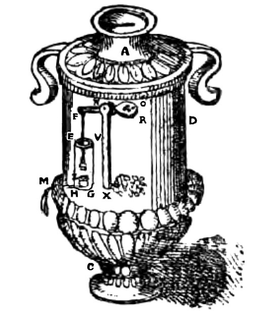 [31] Another pretty conceit of Hero’s is shown in Fig. 8, in which there is a bird which not only makes a noise but at certain times will drink any liquid which is presented to it. The flow of water being intermittent, the cistern forming the pedestal is alternately filled and emptied. While it is being filled the air escapes through a whistle and causes the bird to sing, and when it is being emptied, by means of a siphon, a partial vacuum is produced and liquid presented to it is drawn up through the beak.