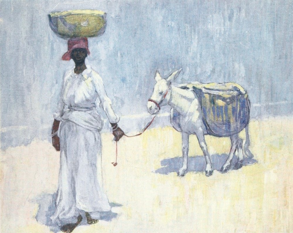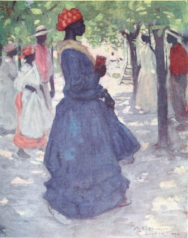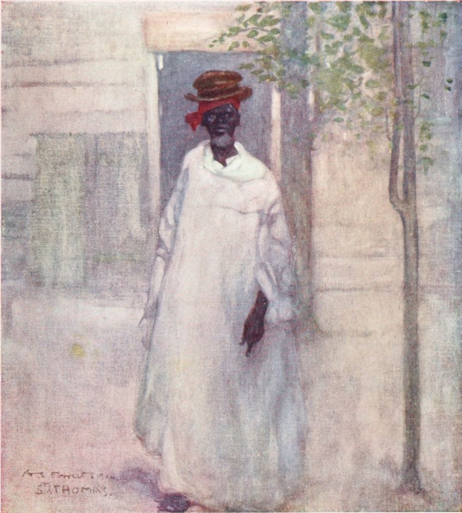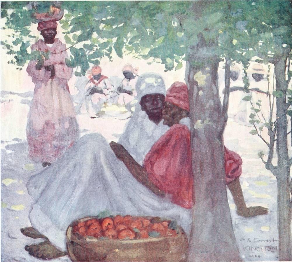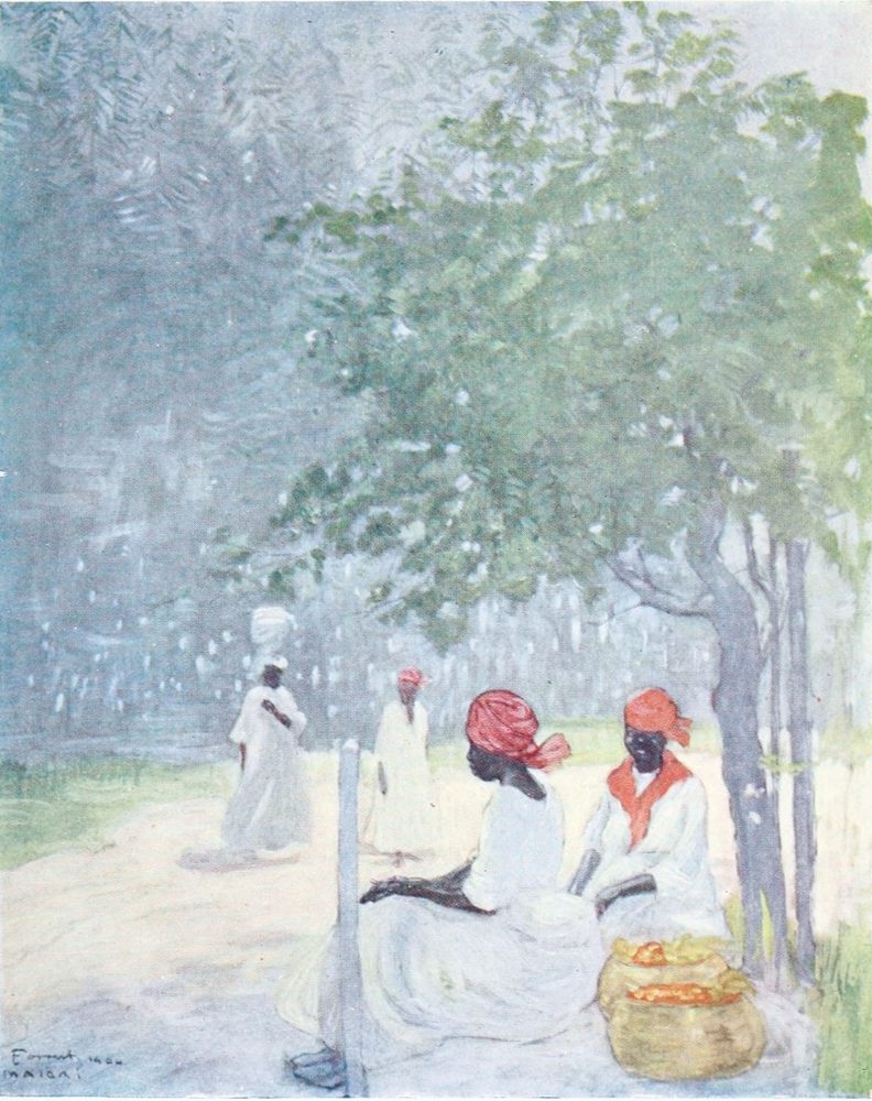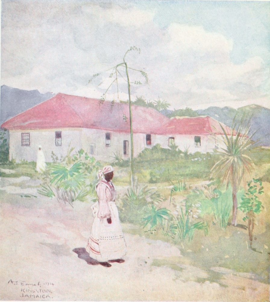 John crow, perched on a bush of scarlet blossoms just in front of where I sat, regarded me with a look of thoughtful contempt. As my nerves got more settled I became conscious of the rich perfumes of the flowers; the insects were buzzing and chirping outside, and the strong sun gave to my shaded resting-place an air of quiet coolness. Graceful negresses were watering the flower-beds; they carried the watering-cans on their heads until they found the particular plant they wished to sprinkle with the refreshing liquid. Their movements were slow and deliberate and very graceful.