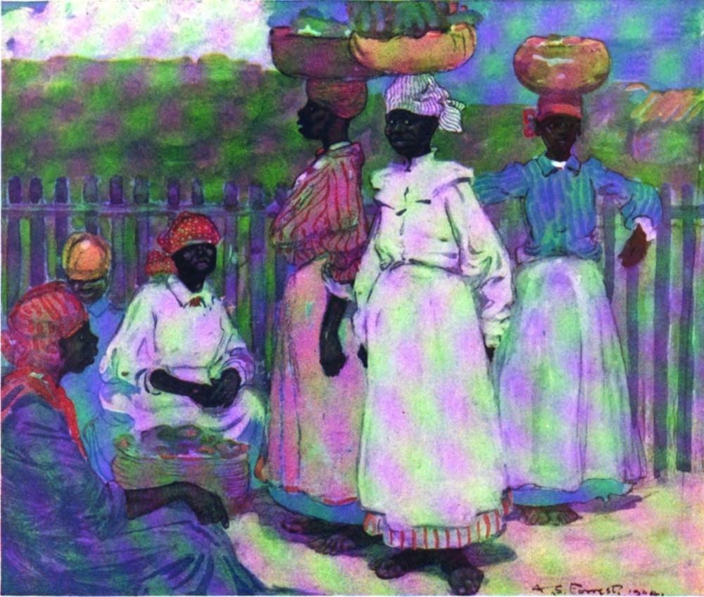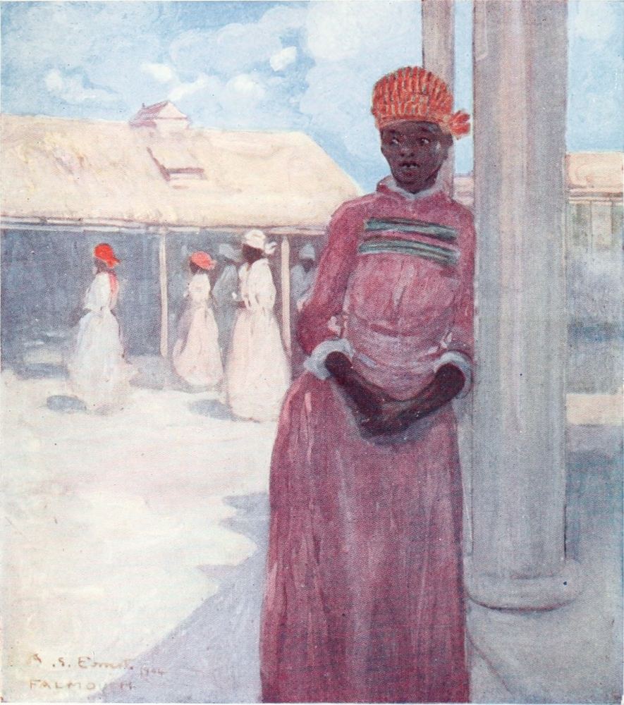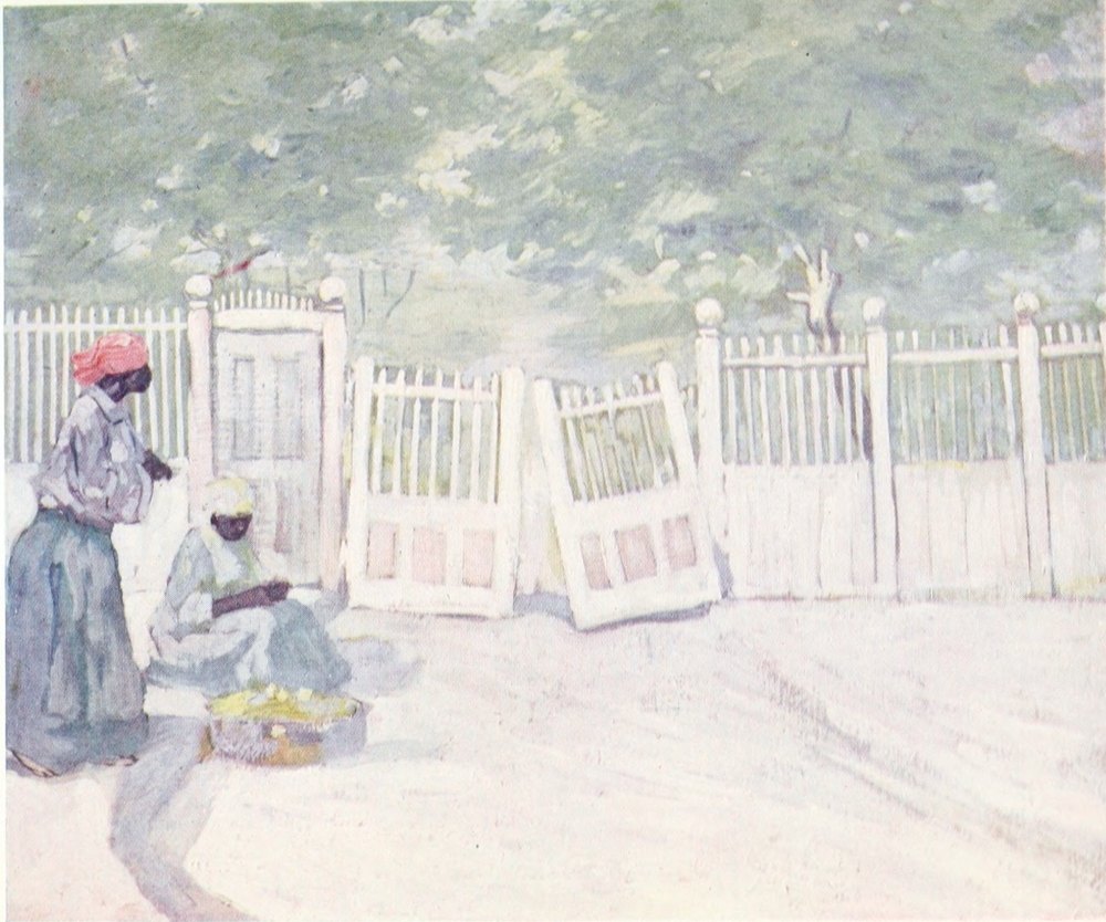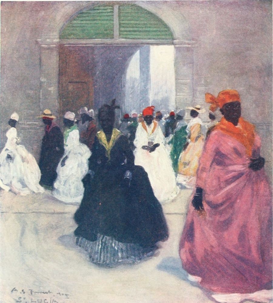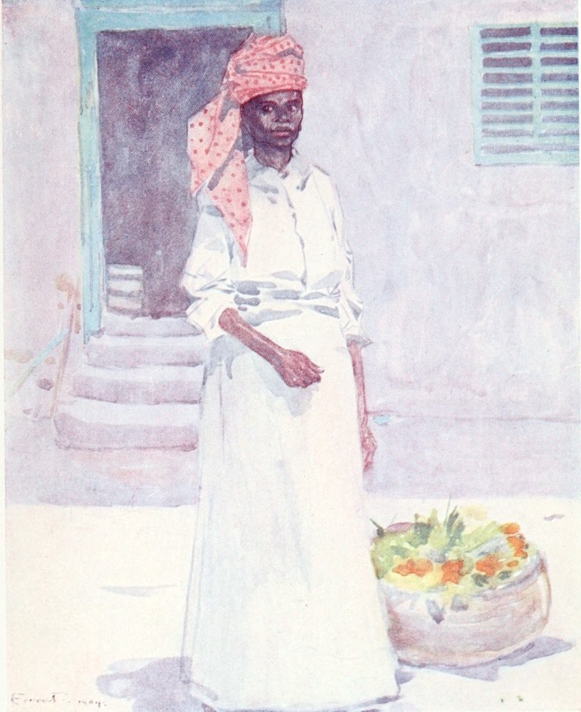 John crow, perched on a bush of scarlet blossoms just in front of where I sat, regarded me with a look of thoughtful contempt. As my nerves got more settled I became conscious of the rich perfumes of the flowers; the insects were buzzing and chirping outside, and the strong sun gave to my shaded resting-place an air of quiet coolness. Graceful negresses were watering the flower-beds; they carried the watering-cans on their heads until they found the particular plant they wished to sprinkle with the refreshing liquid. Their movements were slow and deliberate and very graceful.