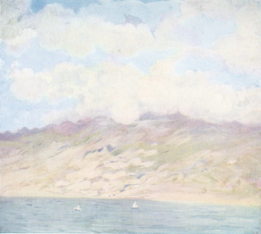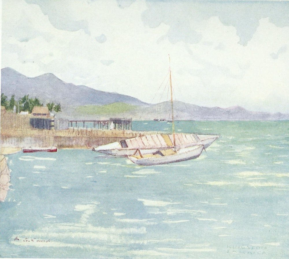 A few hours after leaving Turk’s Island we found Jamaica. Afar off, through the brilliant air of the morning, we saw a tiny pepper-box, which presently turned into a sugar-caster, and gradually, by many complicated but interesting evolutions, developed into a full-fledged lighthouse. The lighthouse is on Morant Point, and Morant Point is the beginning of Jamaica. Columbus named the island Santa Gloria; he was the first European to be bewitched by that low coast-line, all gold shot with green and darker green, stretching back from the sea to the foot of the great Blue Mountains; the Blue Mountains, whose peaks, shrouded in white mist, are buried deep in the hazy sky. Along the shore we sailed, past cane plantations, banana groves, white houses, snow-white roads, and great everlasting clumps of graceful palm-trees. Ahead, standing out at the end of a neck of land, we saw Port Royal—the real, wonderful, most romantic Port Royal, doubly robed in glory by fiction as well as{16} history. Here came Nelson, Rodney, Jervis, Collingwood, and every mighty sailor England ever had.