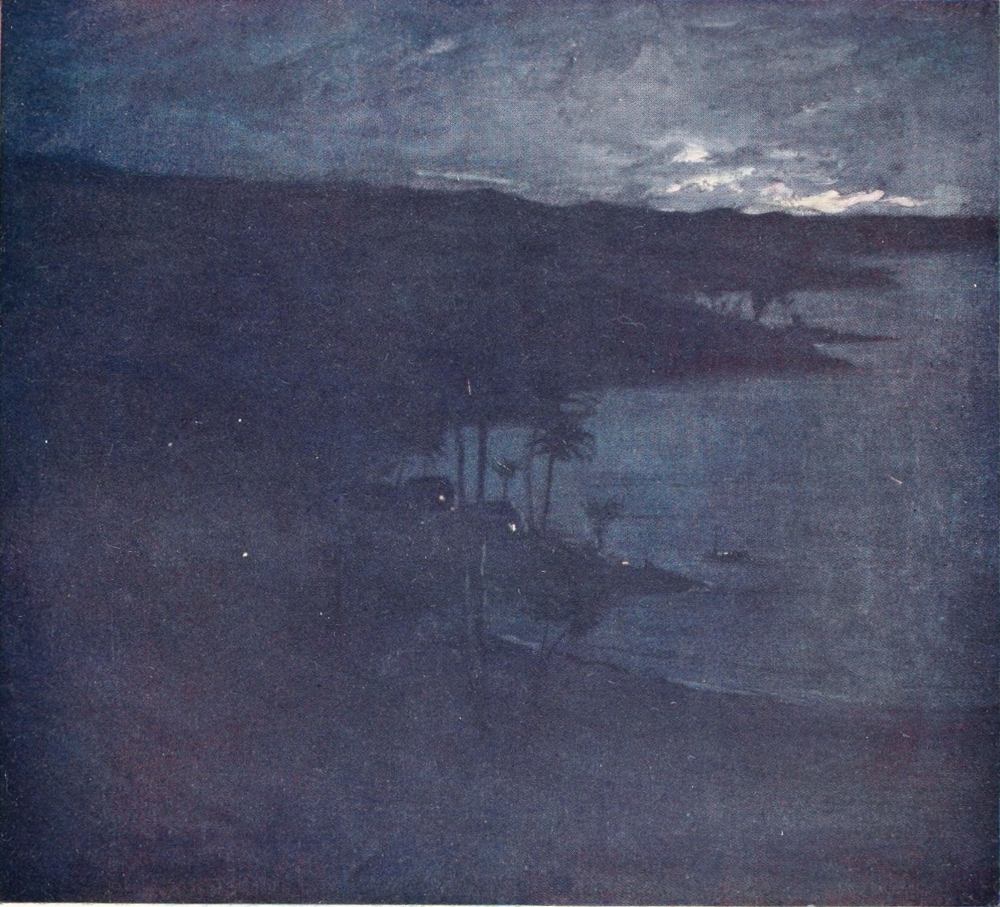 At night there was the wonderful moon and the cool, fresh air. It was pleasant to watch the sea; astern, we left a living, toiling, twisting thread of silver foam; ahead, our bows struck the water, and it flashed fire. Sometimes all was dark; sometimes the sea blazed with phosphorescent light. But always overhead the yellow moon and the golden stars were studded in the blue-black dome of night.