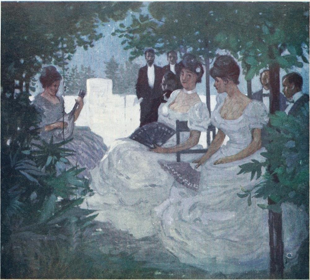 It was a peaceful summer day; from where I sat I could see, afar off, a thin edge of blue beyond the distant confines of the town, and I made out the white patches of the sails of little vessels. I lit my pipe and waited. Suddenly there was a jangle and a crash, and a buggy stopped at the hotel door; in it the head of my friend Forrest appeared from amidst a heap of sketch-books, easels, portfolios, and virgin canvases. I could see by the agonised expression on his flushed countenance that he was very angry. I called the waiter and told him to help the poor struggling artist to disentangle himself from the debris of his paraphernalia.