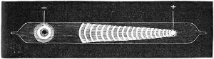 10. They are called vacuum tubes, and are filled while open by putting one end in communication with the vessel in which the gas is generated, and the other end in communication with an air pump. As soon as the atmospheric air is pumped out, the gas rushes in and fills the tube, the communication with the vessel containing the gas is cut off by fusing up that end of the tube, and as soon as the gas is sufficiently rarefied the other end is fused up also. An electrical discharge that will not pass through one inch of air, will pass through thirty or forty inches in a vacuum tube.