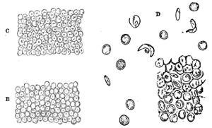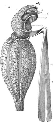 Water in small quantities is secreted night and morning from the points of the leaves of many plants, probably to relieve them from a superabundance of liquid, which evaporation is insufficient to carry off. The arums are remarkable for the quantity they eject. It falls in drops from the points of the leaves. About half a pint is given out every night by the enormous leaves of the Caladium distillatorium, a species of Arad. In 430that plant, and in the Colocasia, the water flows in canals along each rib into a general duct, which runs along the border of the leaf, and terminates in an orifice upon the surface.