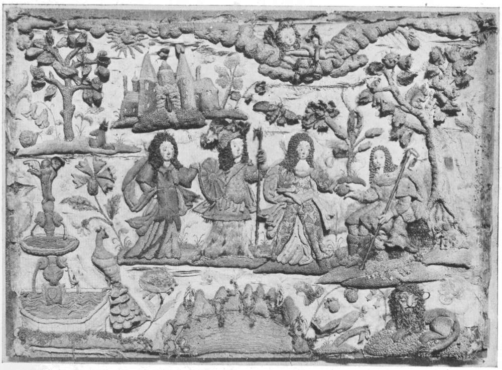 Charles I of England was a king whose art-collecting proclivities produced rich spoils indeed for the Cromwellians. In the quaintly worded old catalogue recording his possessions we find noted among other things, “Item, a landscape piece of trees, and some moorish water, wherein are two ducks a swimming, and some troup of water flowers, being done in a new way, whereof they do make Turkey carpets, which was presented to the King by the French Ambassador, in an all over gilded frame 1 ft. 10 x 2 ft., 5 wide.”{14}