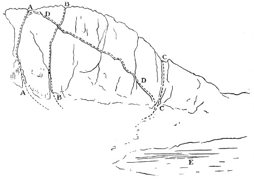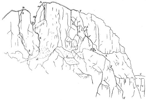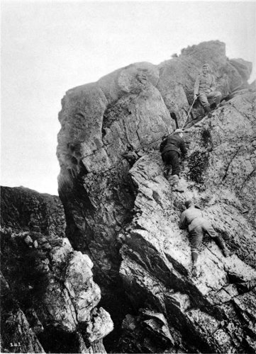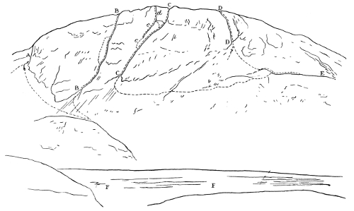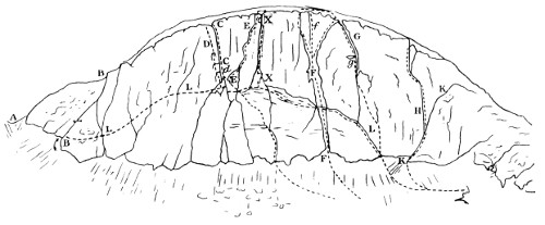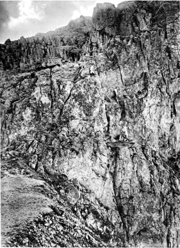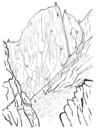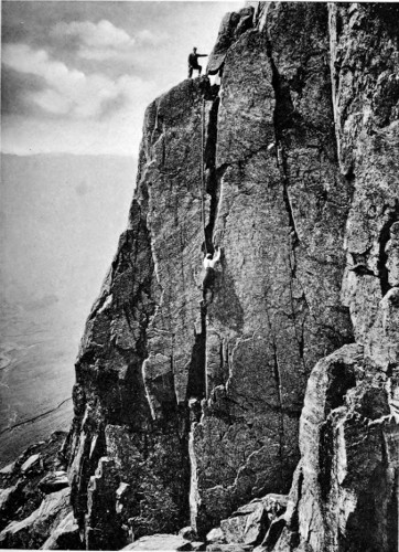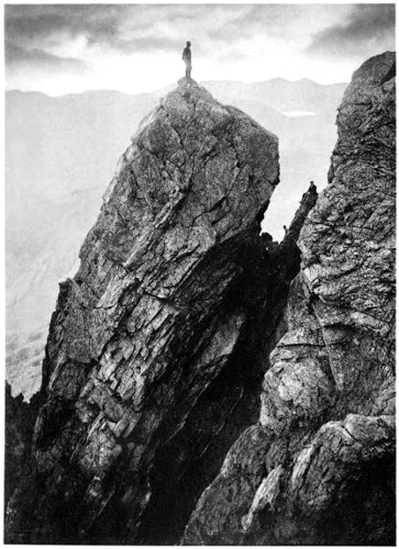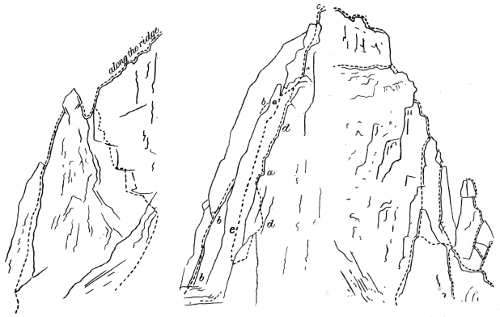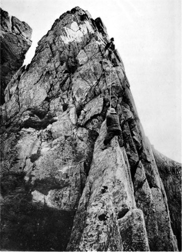 When we commenced the ascent, which proved very easy—I believe we went up the easiest way—the dark, slim young fellow somehow naturally assumed the lead. Before we started he had discovered that I had been to Switzerland and had done some climbs there, so he was very modest about his own powers. A few seconds on the rocks dissipated all doubt. With great confidence and speed, climbing cleanly and safely, he soon showed he was no ordinary climber. I had been out with some very tolerable Swiss guides, but never before with a man to whom rock-climbing seemed so natural and easy. My curiosity was excited. He could not be one of the great climbers, for he had never been out of the British Islands, but he could climb. x